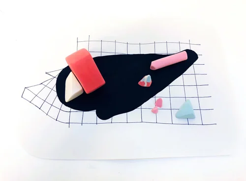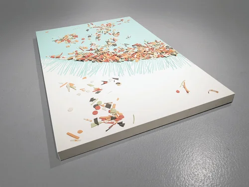 Porcelain, underglaze, paper, colored pencil, mirror.