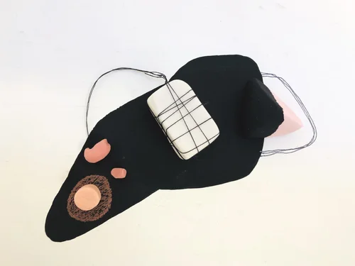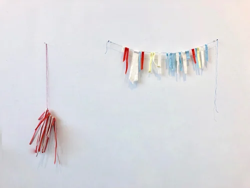 porcelain, underglaze, twine, wire hanger