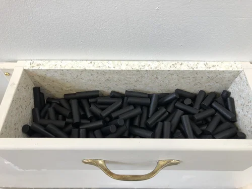 Porcelain, underglaze, shelf paper, found drawers.