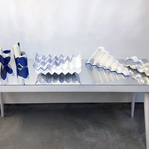 Porcelain, underglaze, mirror, found table.